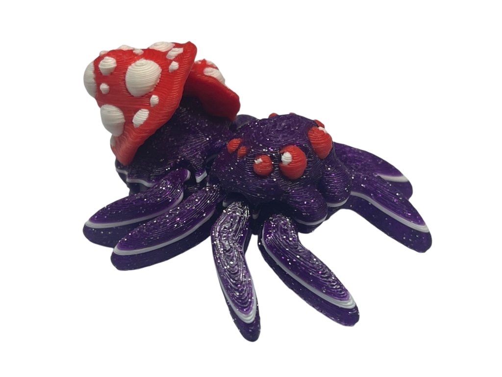 Přidejte do své sbírky kouzelný kousek v podobě Houbového pavoučka, který vypadá jako přímo z fantastického lesa! Tento 3D tištěný pavouček má nádherně fialové třpytivé tělo, které září a přitahuje pohledy, a jeho malá červená muchomůrka dotváří magický design. Je ideální jako dekorace pro každého milovníka přírody, fantasy světů nebo originálních fantasy figurek.