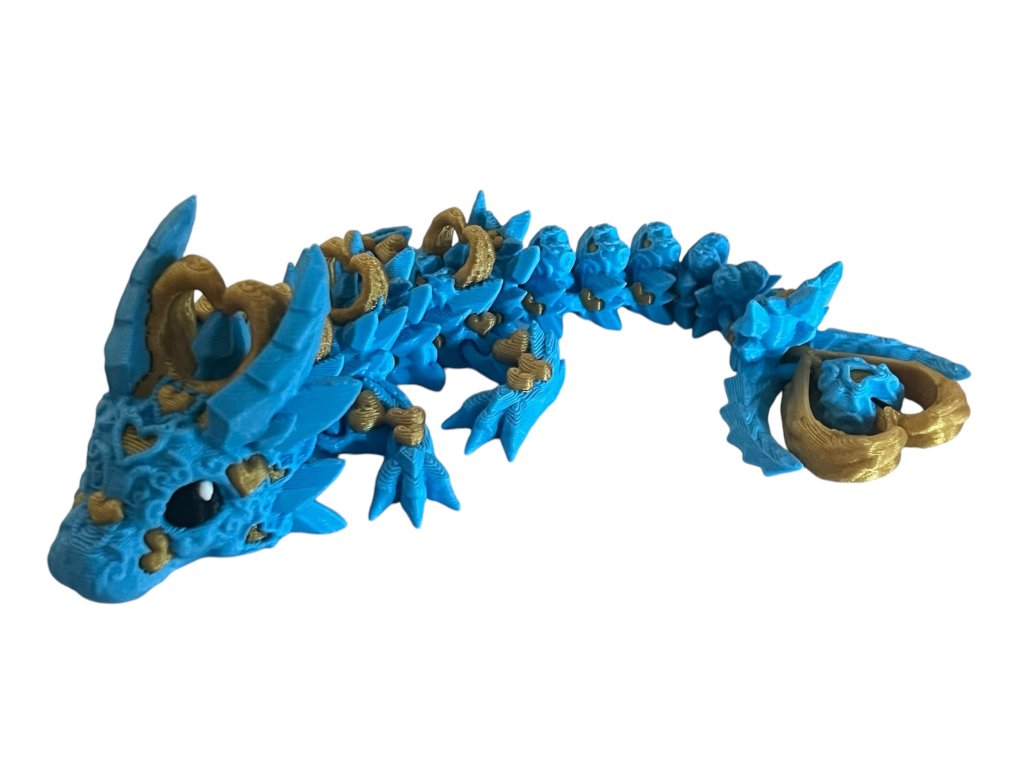 Představujeme jedinečného a elegantního Rohatého srdcového dráčka, který je vyroben ve verzi s rohy namísto peří. Tento 3D tištěný drak má tělo v jemné světle modré barvě, doplněné o elegantní zlatá srdíčka. Díky této barevné kombinaci a jeho rohatým prvkům je ideální volbou pro každého, kdo si potrpí na stylové doplňky z fantasy světa.